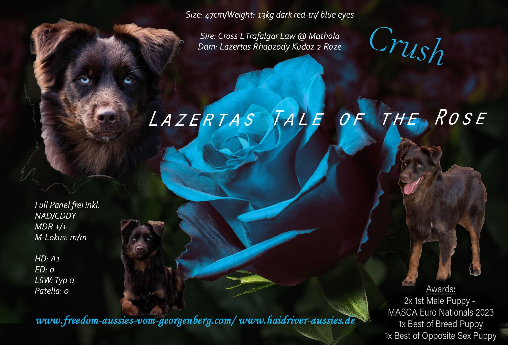 Die "Heimkehr" von Crush, ein ganz besonderer Moment für uns. Unsere erste Aussie Genertion - Jesy und Nita sind die Ur-Ur Großeltern von Crush. Dies liegt nun über 17 Jahren zurück wo wir die liebe Julia kennen lernen durften. Julia kam zu uns um sich Ihre "Rose" auszusuchen. Jeder der Julia und Rose kennt, weis von was bzw. wem ich hier schreibe.